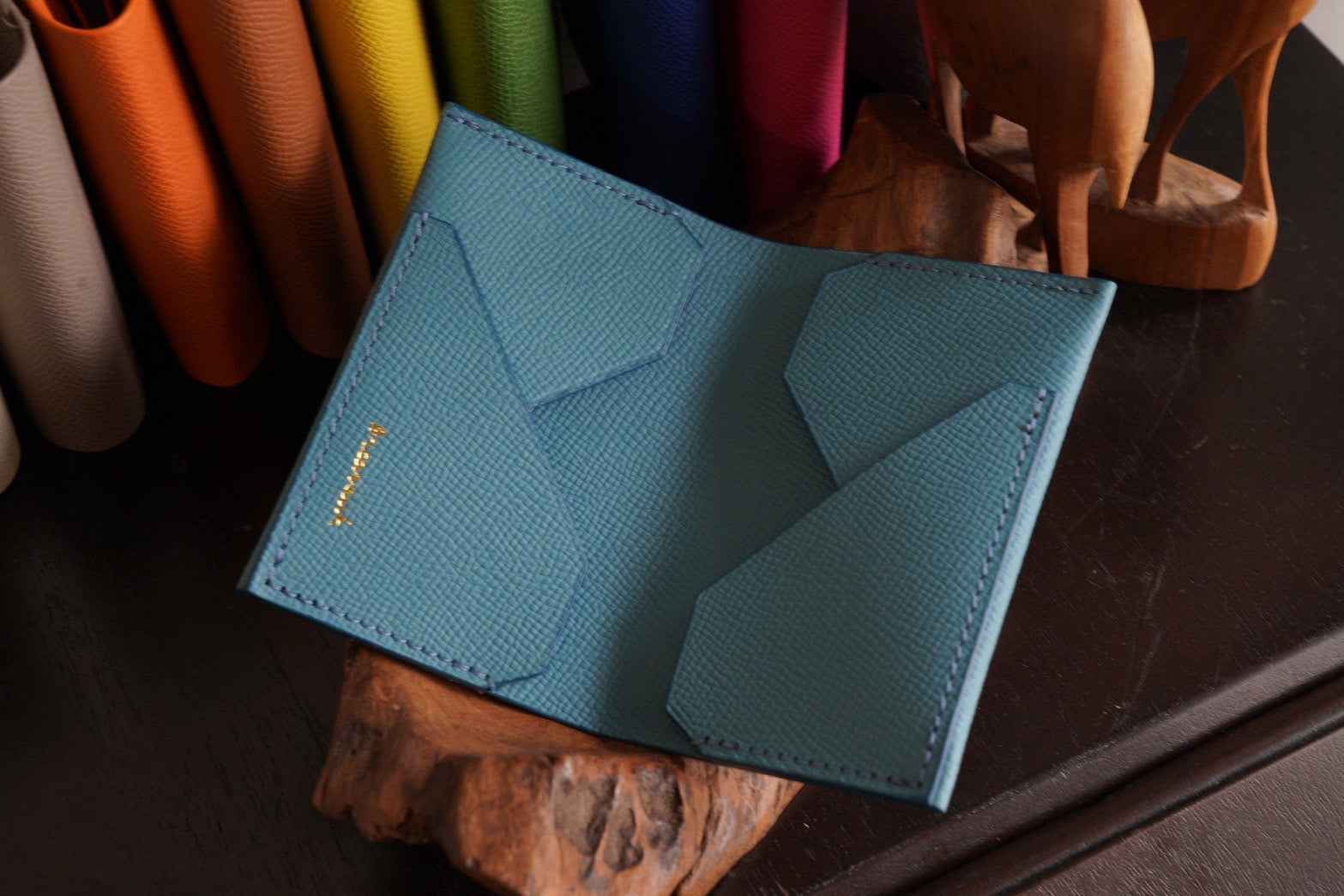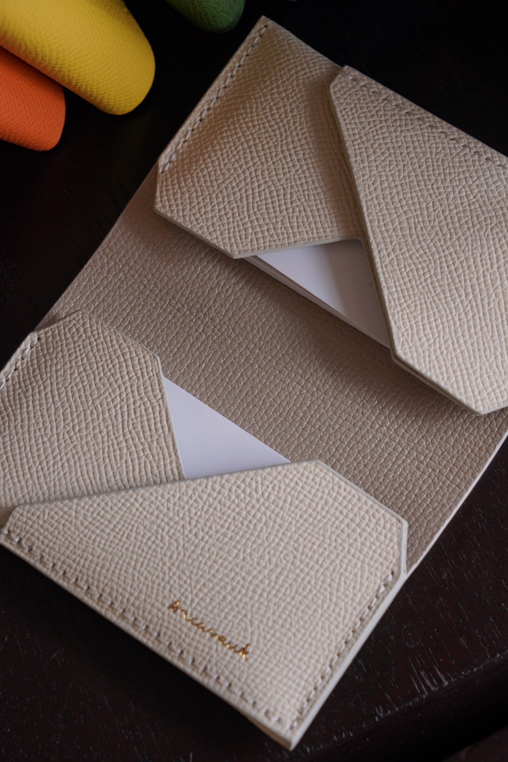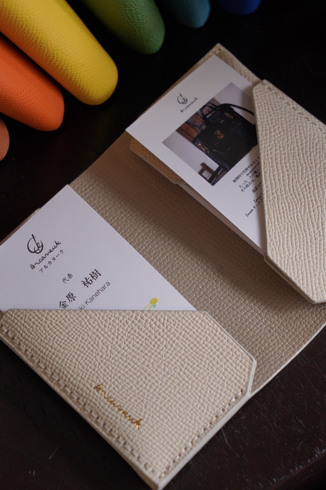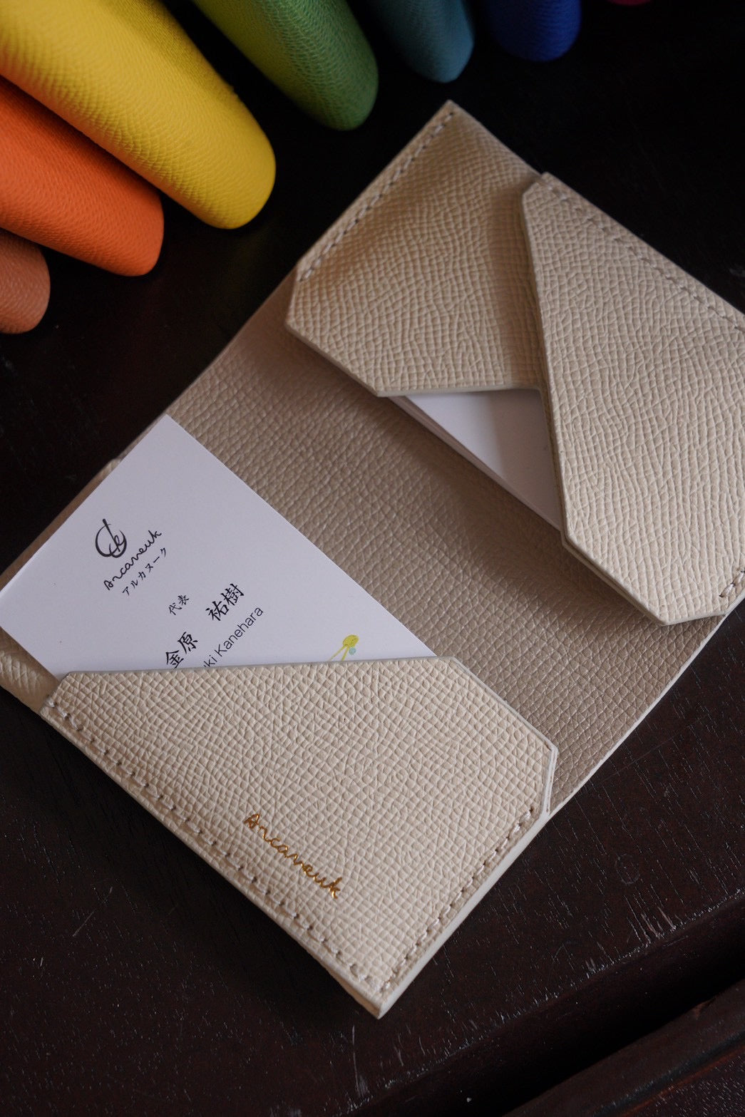 扉を開くと左右対称に配置されたカードポケットがあり、それぞれ名刺が20〜30枚程度収納可能です。片方には自分の名刺を、片方には相手方に名刺を。使い分けも非常に便利で、名刺以外にもクレジットや定期券なども収納できるゆとりがあり、持つ人の日常にフィットします。表面にはフレンチカーフレザーを採用しており、高級感ある見た目に極上の触り心地を演出しております。内装には発色の鮮やかなイタリアンレザーを差し込み、Arcaneukらしいカラーバランスで持ち主の個性を大切にします。