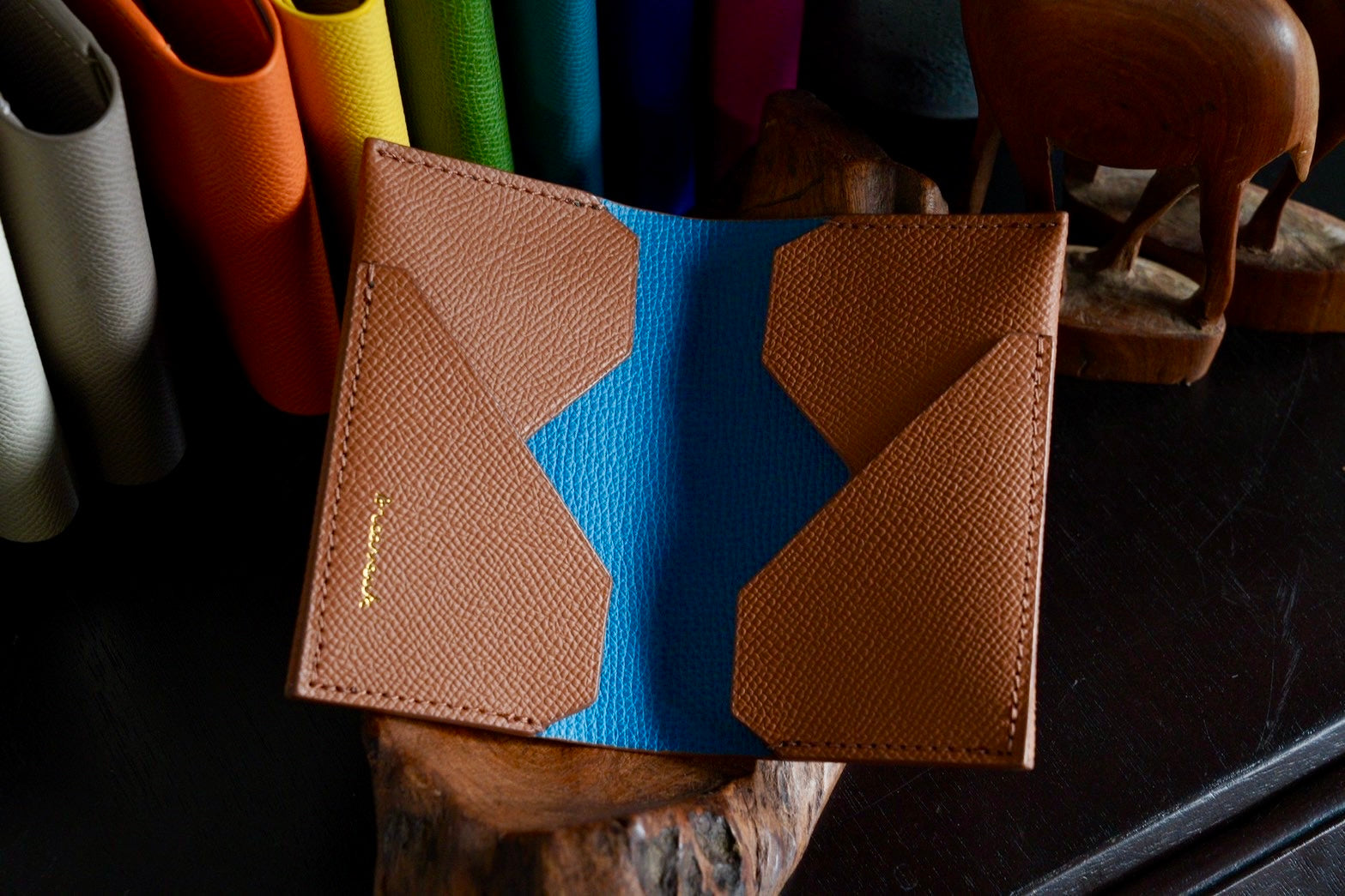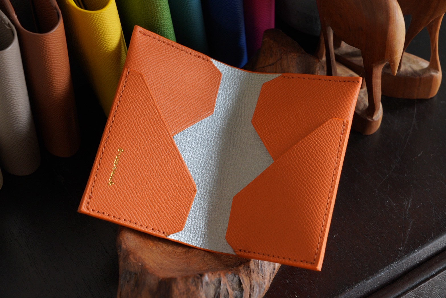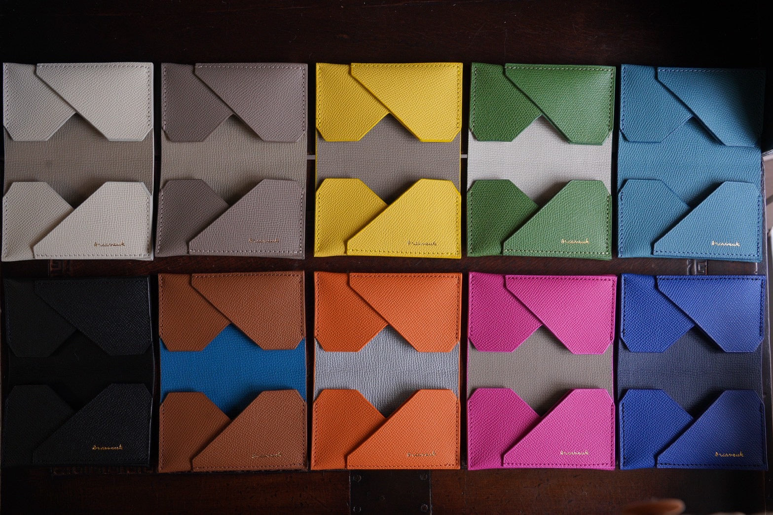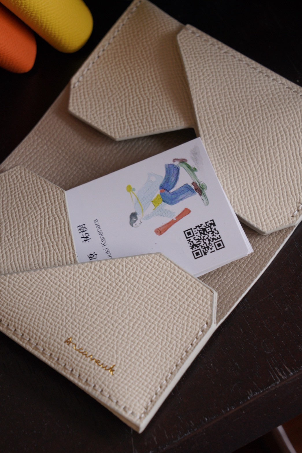 扉を開くと左右対称に配置されたカードポケットがあり、それぞれ名刺が20〜30枚程度収納可能です。片方には自分の名刺を、片方には相手方に名刺を。使い分けも非常に便利で、名刺以外にもクレジットや定期券なども収納できるゆとりがあり、持つ人の日常にフィットします。表面にはフレンチカーフレザーを採用しており、高級感ある見た目に極上の触り心地を演出しております。内装には発色の鮮やかなイタリアンレザーを差し込み、Arcaneukらしいカラーバランスで持ち主の個性を大切にします。